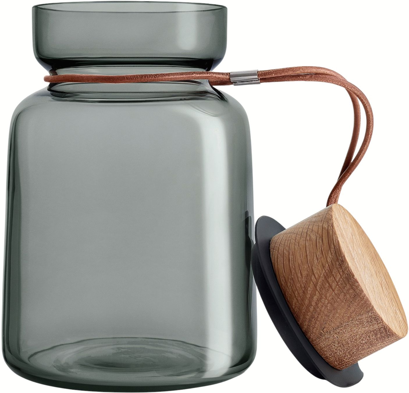 Het deksel van geolied eikenhout vormt een warme tegenstelling tot het koele glaswerk en is voorzien van een stijlvolle leren band die zowel decoratief als functioneel is. Deze doordachte combinatie van materialen weerspiegelt de Scandinavische designtraditie waarbij vorm en functie hand in hand gaan.