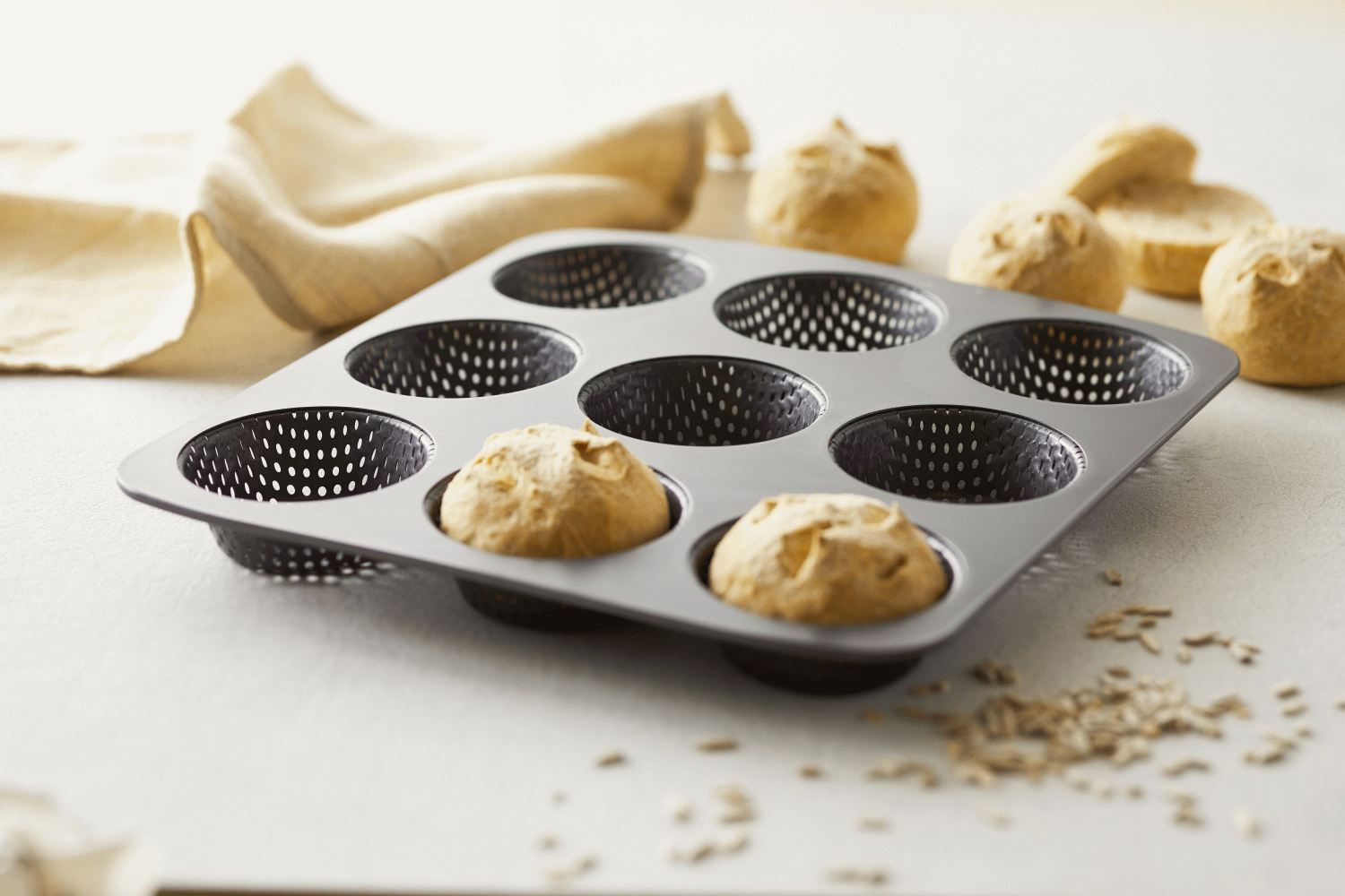 Deze Scandinavische bakplaat van 32x30 cm biedt voldoende ruimte voor 9 perfect gevormde ronde broodjes. Met een hoogte van 3,2 cm hebben jouw broodjes alle ruimte om mooi te rijzen en hun vorm te ontwikkelen tijdens het bakken. De robuuste constructie is bestand tegen ovntemperaturen tot 230 graden, wat deze vorm geschikt maakt voor alle soorten broodjesdeeg - van klassieke ontbijtbroodjes tot hamburgerbroodjes en zoete varianten.