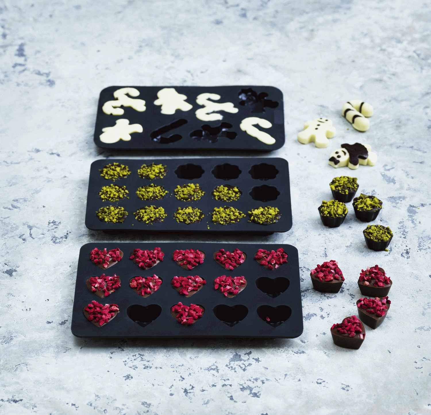 - Produceert in totaal 38 chocoladefiguren (15 bloemen, 15 harten, 8 kerstmotieven)